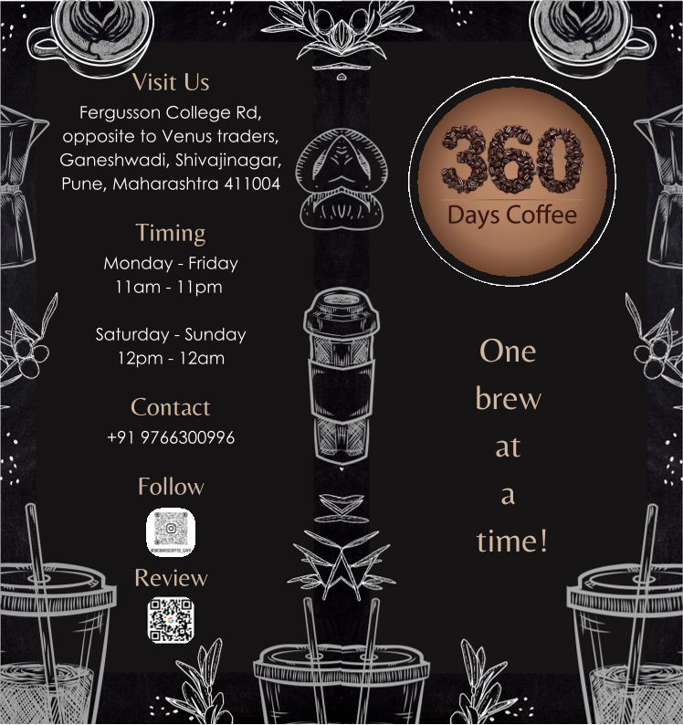 Welcome to 360 Days Coffee, a hidden gem located on Fergusson College Road, Pune. This cafe stands out not just for its convenient location but also for its tantalizing menu. Whether you're a coffee enthusiast or a vegetarian food lover, there's something for everyone.